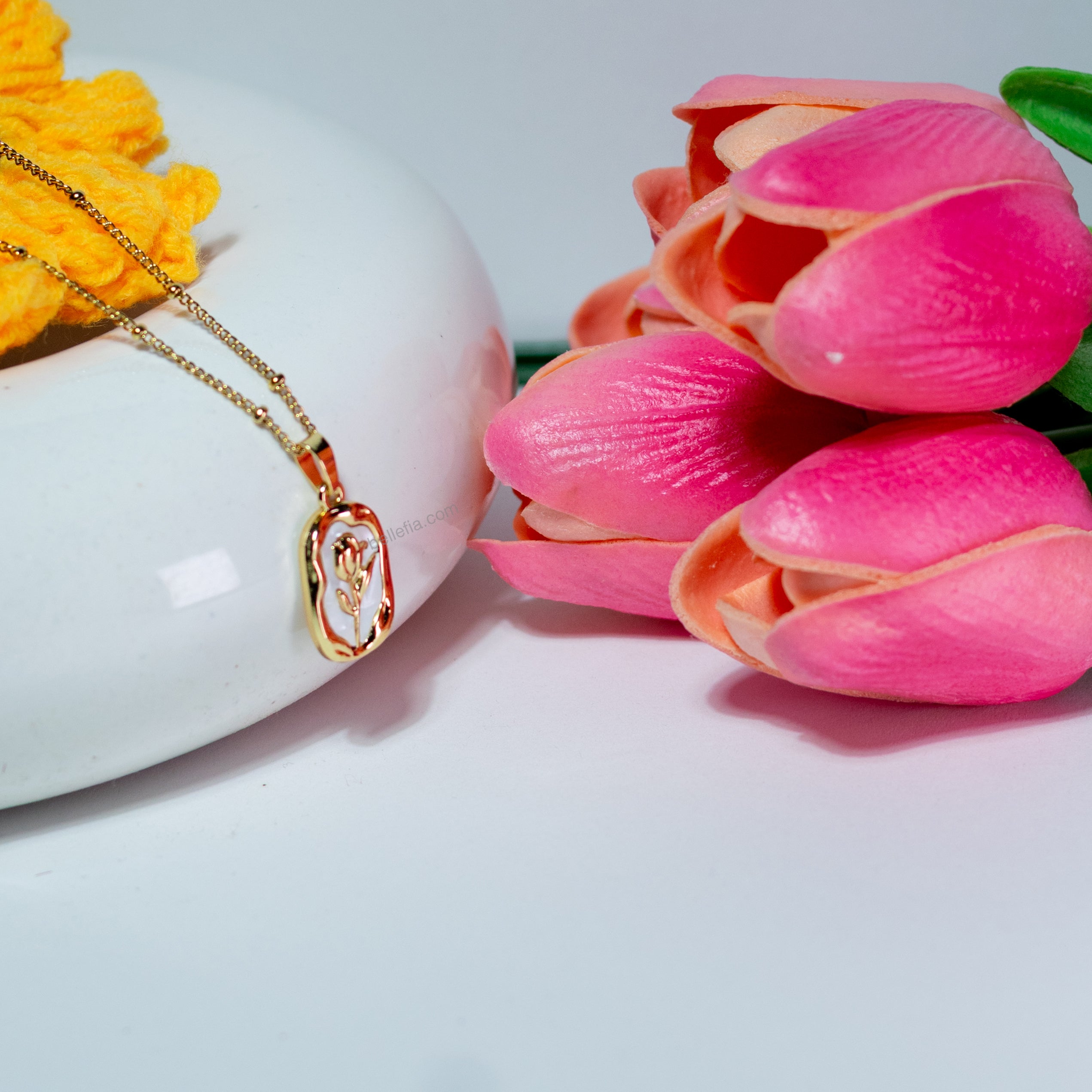 Add timeless elegance to your collection with the White Rose Charm Gold Pendant Necklace. Designed with a delicate rose motif over a pearly white enamel base, this anti-tarnish gold-plated necklace brings a soft, feminine touch to any outfit. Lightweight, durable, and perfect for daily wear or gifting.